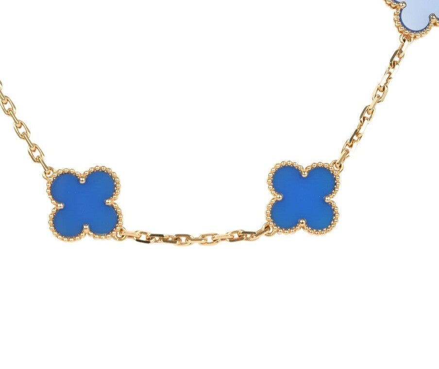 Van Cleef & Arpels Vintage Alhambra 10 Motif Necklace Blue Agate 18K Yellow Gold Hardware